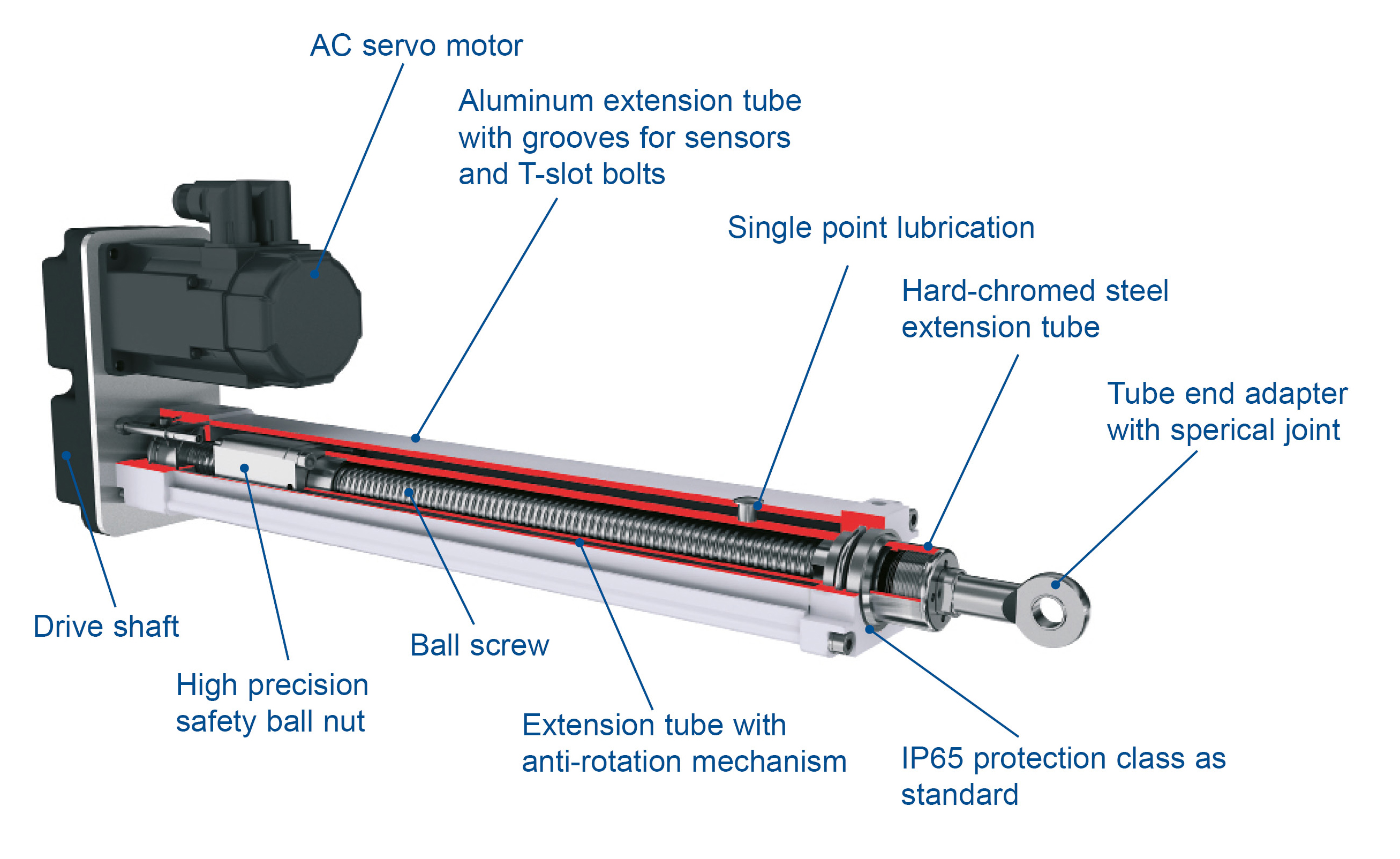 Loosened by aging, the seals of hydraulic cylinders wear out and begin to rotate. Because hydraulic cylinders are optimized for linear, and not rotational, loads, cylinder seal wear disturbs the alignment between the actuator piston rod and the grinding wheel, leading to binding or jamming of the piston and wobbling of the grinding wheel. The Thomson T130 actuator eliminates rotational problems with designed-in anti-rotation functionality. It uses an internal square guide rail nut, which prevents the extension tube from rotating if it is not attached to any load.
